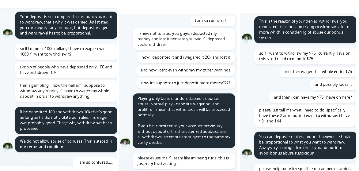 OilyPuss Posted September 23, 2021 Share Posted September 23, 2021 Everyone beware, support denied a tiny withdraw of $75 i tried to make. They claimed my deposits were not proportional to what i was trying to withdraw. They forced me to deposit more money and to wager that money in order to withdraw MY money that i had already won on this site. they claimed it to be abuse of tips, and abuse of bonus. this is a FYI for anyone who is interested in this information, this is very sketchy. Link to comment Share on other sites More sharing options...