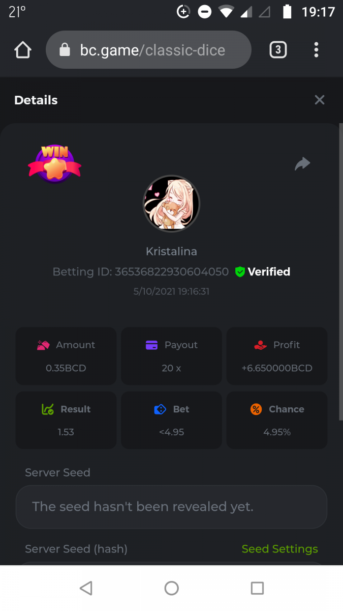 BCDash Posted October 8, 2021 Author Share Posted October 8, 2021 Happy Friday all! Here's a weekend challenge for you: The next 5 contestants to post two exact rolls back to back will receive an extra $20 prize (ie. 33.33 and 33.33 results right after each other). It's something you can look for while you're going for the challenge payouts, no need to hunt separately Nonce of the two bets must be right next to each other, for example nonce 5 and nonce 6. You may not change seeds for this. All challenge rules apply. Rolls must be made after I post this. Offer expires the same time as the challenge does. Good luck! "Life is the biggest scam of all, because eventually you die." - digitaldash Link to comment Share on other sites More sharing options...