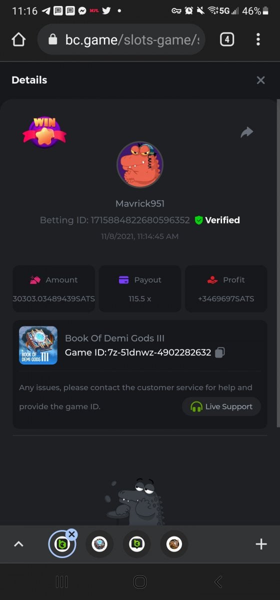 Mavrick951 Posted November 8, 2021 Share Posted November 8, 2021 On 11/2/2021 at 1:37 PM, BCGame_Joe said: Starts: 2, November 20:00 GMTEnds: 9, November 20:00 GMT Welcome back, this week we have a Spinomenal slot event, with a huge $4,000 prize pool! The event is simple - get the highest possible multiplier you can on the slots listed below! The top 3 highest multipliers posted for each slot will win one of the ranked prizes! To sweeten the treats a little further, anyone that completes the side bounty will receive a share of $400(details further down). Eligible Games Get the highest multiplier on any (or all) of the 4 slots below Book of Demi Gods III Majestic King Joker Win Demi Gods III Each player can only win 1 prize per slot, if a player submits more than 1 entry for the same slot, only the highest multiplier will count. Can I win a prize for each of the slots? YES - you can win one prize on each of the 4 slots listed + the bounty prize. Minimum VIP Tier Must be VIP08 or higher in order to enter this challenge. Minimum Bet Size Book of Demi Gods III - $0.20 Majestic King- $0.25 Joker Win - $0.20 Demi Gods III - $0.30 Eligible Coins All coins are eligible (excluding JB) Available Prizes Book of Demi Gods III - 1st place $500 2nd place.$250 3rd place$150 Majestic King - 1st place$500 2nd place$250 3rd place$150 Joker Win - 1st place -$500 2nd place$250 3rd place$150 Demi Gods III - 1st place$500 2nd place$250 3rd place$150 50x BOUNTY - Post a bet that shows EXACTLY 50x payout on any of the 4 slots within the timeframe of this challenge and receive a share of a $400! If nobody gets exactly 50x the person/s closest to 50x will win this bounty! How to Enter To enter, copy the bet ID of the bet you'd like to submit Once you've copied it, post it as a reply to this thread like so: Betting ID: 1708854428417660423 In the same post, upload a screenshot of your win by clicking the game ID WITH VIEW IN USD mode ENABLED (accessible at the bottom of dropdown menu for your wallet up top. This way, we can ensure that your bet indeed met the minimum requirement at the time of placing it: Example post - Betting ID: 1715345879721985408 Good Luck Everyone! Heres one book for demi gods 3 EDIT: make that 2 Betting ID: 1715884076127259143 Betting ID: 1715884822680596352 Link to comment Share on other sites More sharing options...