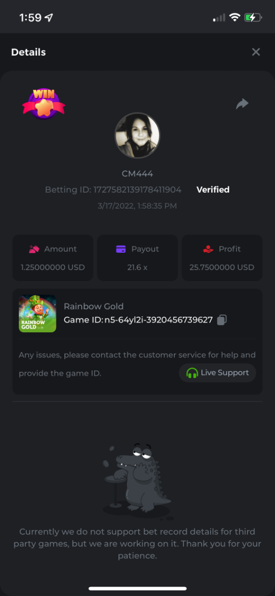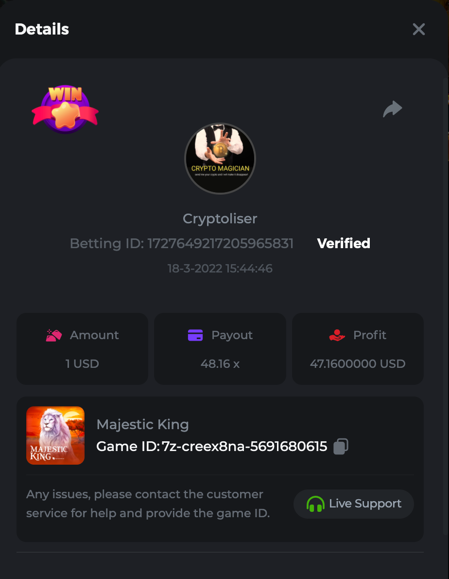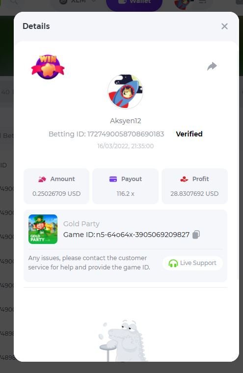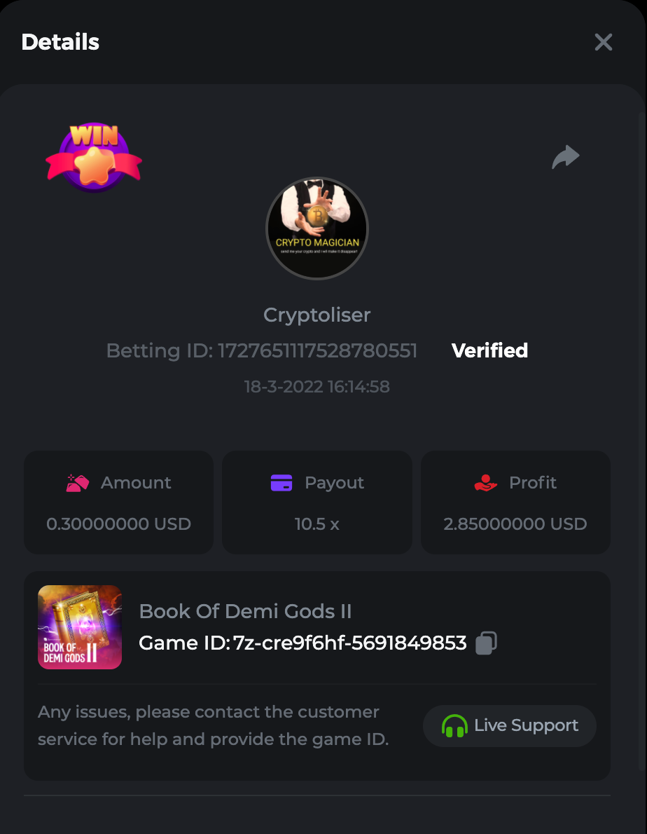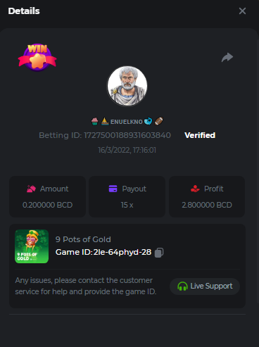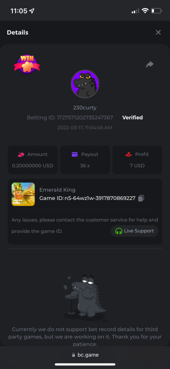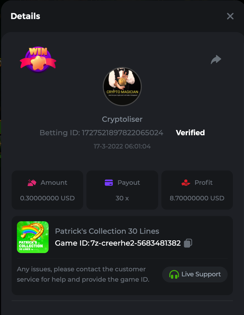 In the same post, upload a screenshot of your win by clicking the game ID WITH VIEW IN USD mode ENABLED (accessible at the bottom of dropdown menu for your wallet up top, and Submit Reply. Done! This way, we can ensure that your bet indeed met the minimum requirement at the time of placing it: