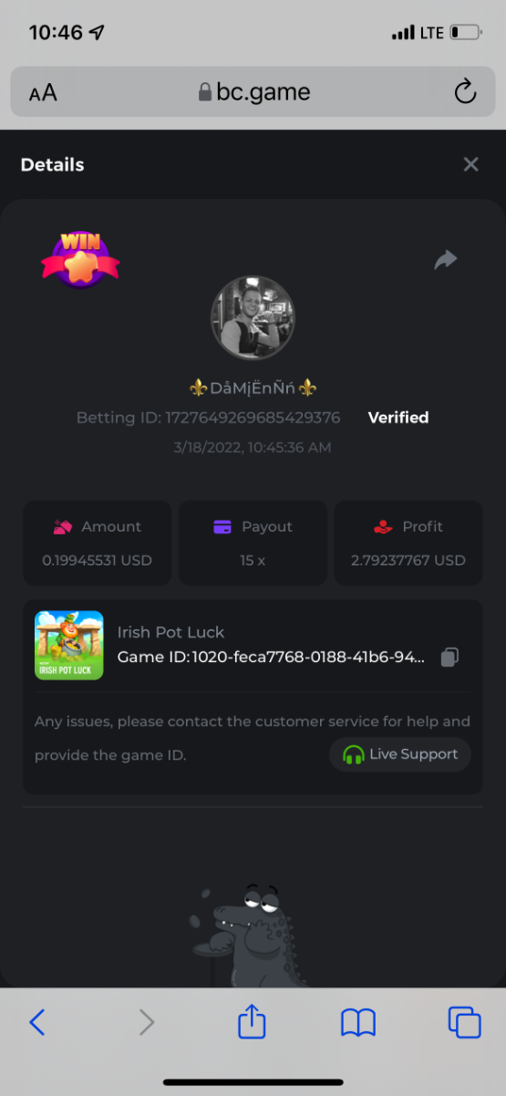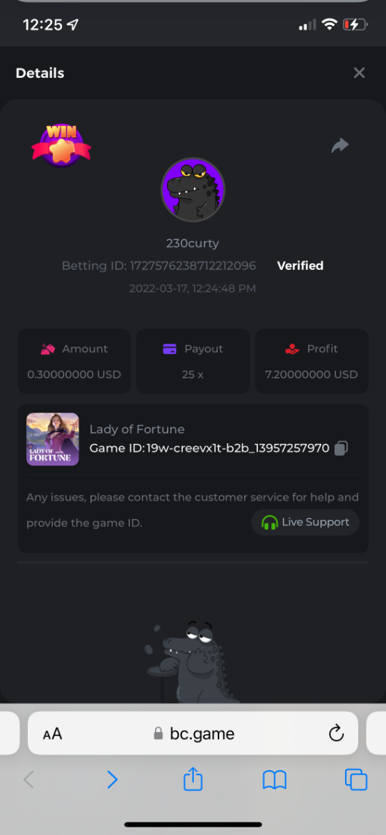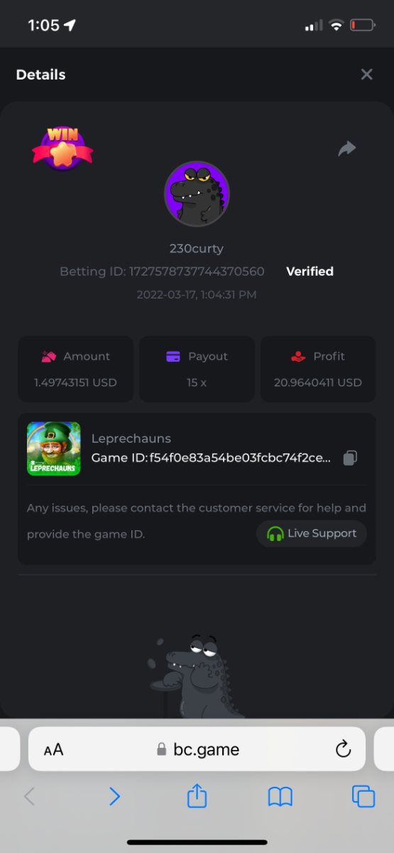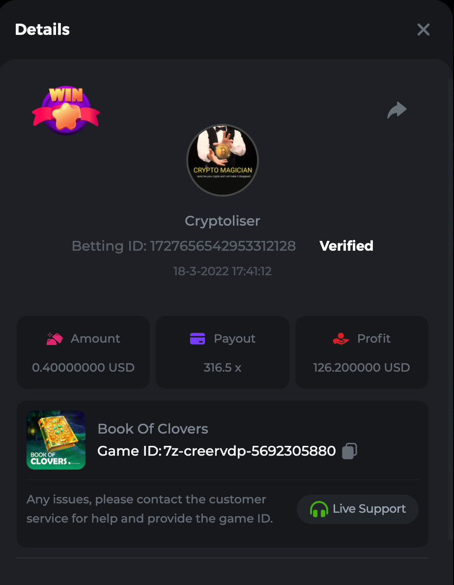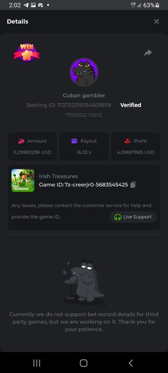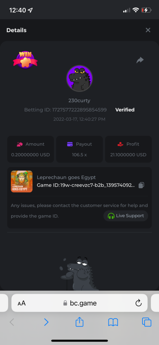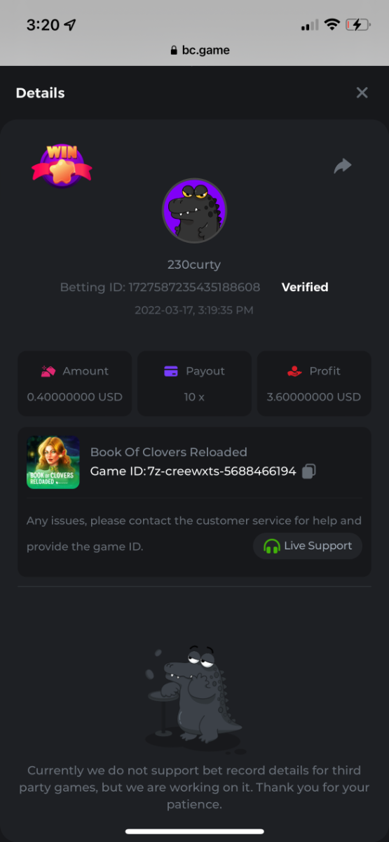 In the same post, upload a screenshot of your win by clicking the game ID WITH VIEW IN USD mode ENABLED (accessible at the bottom of dropdown menu for your wallet up top, and Submit Reply. Done! This way, we can ensure that your bet indeed met the minimum requirement at the time of placing it: