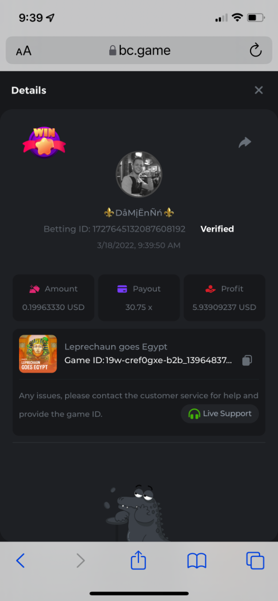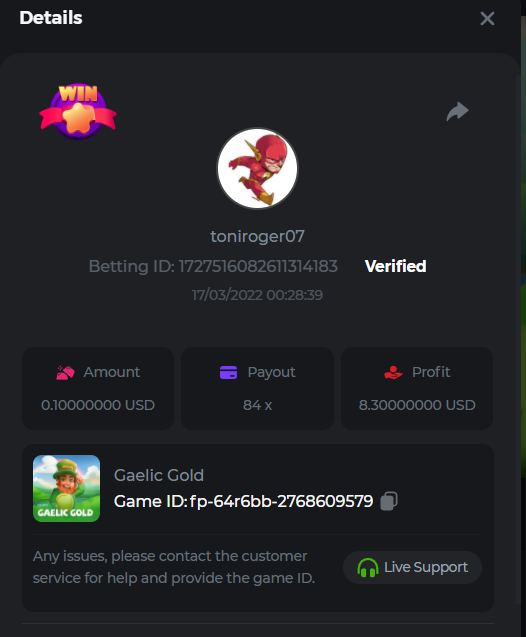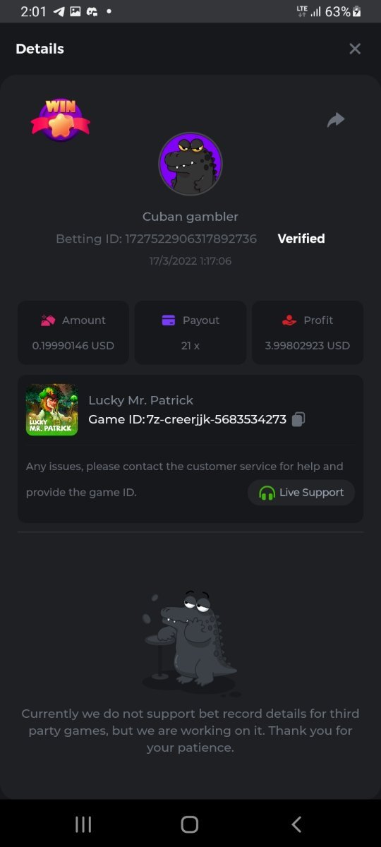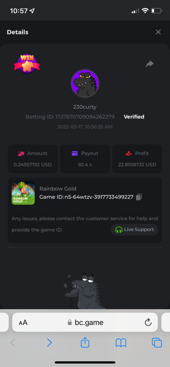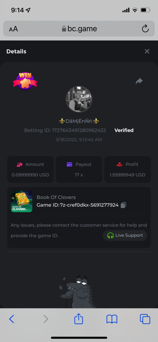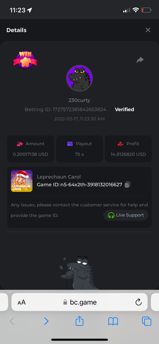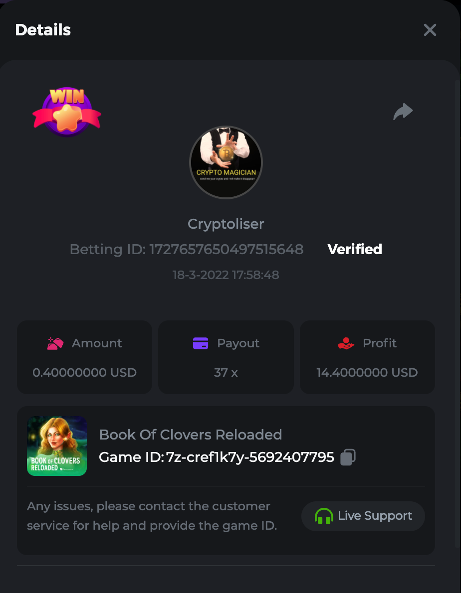 In the same post, upload a screenshot of your win by clicking the game ID WITH VIEW IN USD mode ENABLED (accessible at the bottom of dropdown menu for your wallet up top, and Submit Reply. Done! This way, we can ensure that your bet indeed met the minimum requirement at the time of placing it: