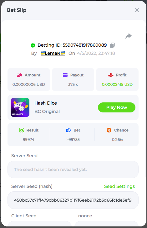 Moderator Mat Posted May 2, 2022 Moderator Share Posted May 2, 2022 Desafio Semanal Hash Dice Inicio: 2 de Maio 21h -3 UTC Encerra: 8 de Maio 21 -3 UTC "This challenge is only for the people from the Portuguese room" Tente acertar o maior número possível de multiplicadores no Hash-Dice da lista a seguir... 250 | 375 | 500 | 625 | 750 | 875 | 1000 Cada pagamento que você acertar acima conta como 1 ponto . Se houver empate, o jogador com o maior valor médio de aposta (em USD) será o vencedor. VIP mínimo Não há nível VIP mínimo Pagamentos mínimos Acerte pelo menos 3 pagamentos para se qualificar Aposta mínima Não há valor mínimo Moedas elegíveis Todas as criptomoedas são elegíveis (exceto JB e BCL) Prêmios disponíveis 1º lugar ....... $5 2º lugar ..... $3 3º Lugar ...... $2 Como entrar Para participar, copie o link da aposta que deseja enviar. Depois de copiá-lo, cole-o como resposta a este tópico da seguinte forma: Link: https://bc.game/sd/?sd=10JPK6DKWUPY4Z Na mesma postagem, faça o upload de uma captura de tela de sua vitória clicando no ID do jogo COM VISUALIZAÇÃO NO modo USD ATIVADO (acessível na parte inferior do menu suspenso da sua carteira na parte superior. Dessa forma, podemos garantir que sua aposta realmente atendeu ao requisito mínimo no momento da colocação: Link: https://bc.game/sd/?sd=10JPK6DKWUPY4Z Por favor, combine todos os seus hits em um ÚNICO post. Edite sua postagem existente para obter hits adicionais, não crie uma nova postagem. Uma (1) entrada por família . Qualquer pessoa encontrada com multiconta será desqualificada deste desafio, bem como de todos os desafios futuros. As apostas devem ser feitas durante a janela de tempo especificada acima. Este encadeamento será bloqueado automaticamente quando o período de tempo terminar. O não cumprimento das instruções resultará na nulidade do seu envio. Os pagamentos serão feitos dentro de 72 horas após a conclusão do desafio, por favor, seja paciente, prometemos que não esquecemos. Os prêmios serão pagos em BCD. Boa Sorte Link to comment Share on other sites More sharing options...