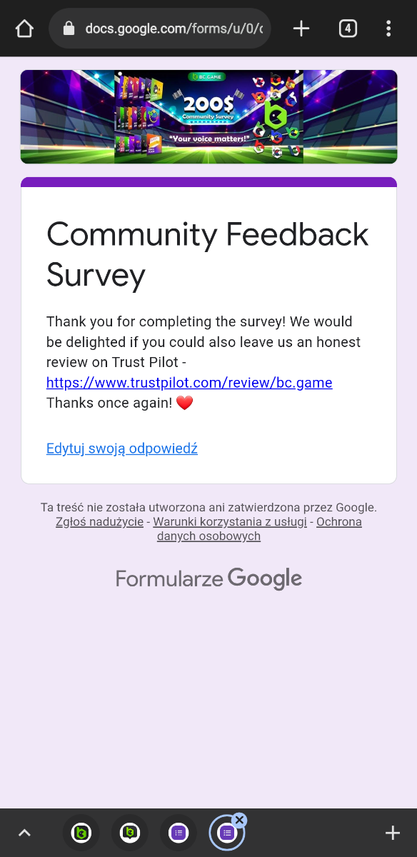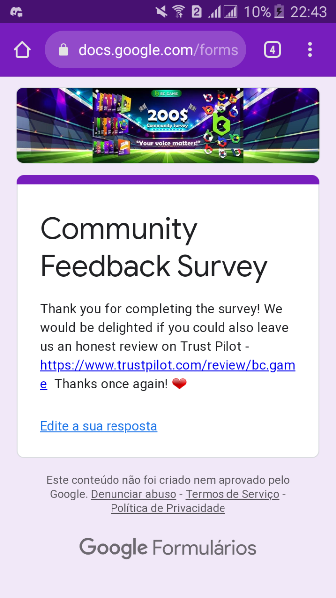 GainZzGreene Posted May 10, 2022 Share Posted May 10, 2022 On 5/6/2022 at 1:36 AM, BCGame_POP said: At BC.GAME, we have constantly been evolving from the feedback we get from users on the various features we offer. Be it the Lucky Wheel or BCD Dashboard. We always kept on revolutionizing new features in the Crypto Gambling industry. We want your feedback on various features of our Casino like Wallet Enhancements, BCD Rewards, Gameplay Integrations, etc. Please take a moment to fill out the survey form here - https://bit.ly/bcgamecommunitysurvey Giveaway Details: 30 users who filled the survey will be randomly picked and be rewarded 5$ each after the event's commencement. 5 users who give good suggestions will be handpicked and rewarded 10$ each. Anyone with a BC.GAME account can participate in this survey. If you have anything else to say, you can always leave a comment on this thread. If i win or not please take my feedback into account, but if i do win lol user - Gain Greenegwc Link to comment Share on other sites More sharing options...