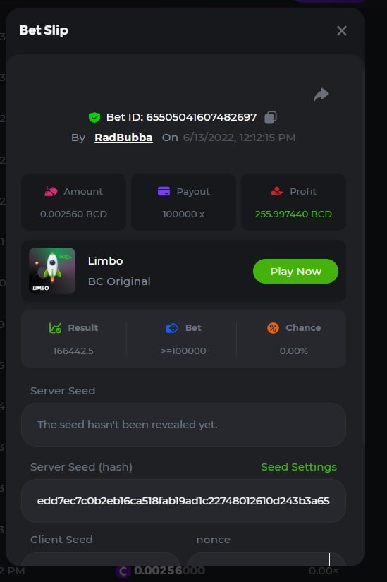 HzdsWste Posted June 14, 2022 Share Posted June 14, 2022 One good memory.. 100000x on limbo;) 6/13/22 https://bc.game/sd/?sd=10MKYMML7Q0CUR Bet ID: #65505041607482697 Link to comment Share on other sites More sharing options...